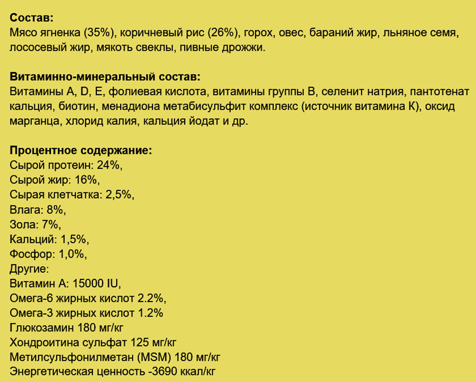 Также указано содержание в корме жирных полиненасыщенных кислот Омега-3 и 6. Энергетическая ценность килограмма такого корма составляет 4900 ккал.