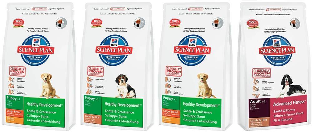 - Science Plan — повседневная полнорационная диета. В этой линейке есть множество вариантов (для собак крупных пород, щенков мелких пород, взрослых собак, псов гигантских пород, пожилых животных);