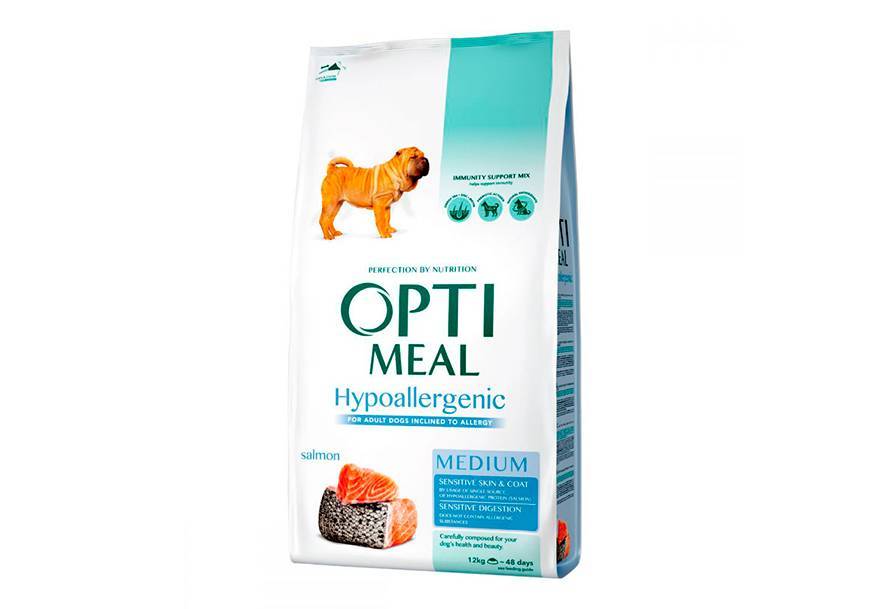 Корм ОптиМил из этой линейки подходит для собак с чувствительной кожей и пищеварением. В состав входит дегидратированный лосось, полезные углеводы (ячмень и рис) и минеральные добавки. Включены редкие ингредиенты, как: корень лопуха, корень алтея, бархатцы. Достойный корм, который без опасения можно давать питомцу.