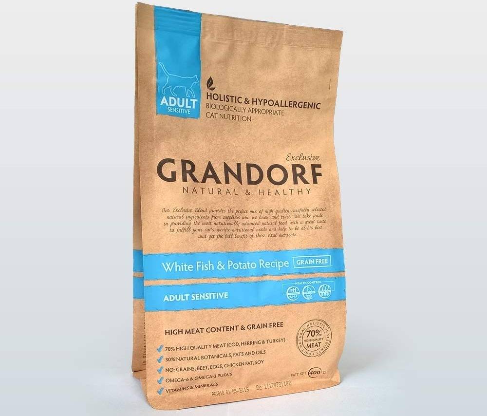 Если вашему питомцу нужен корм, богатый белками, то это Grandorf, который содержит небольшое количество углеводов в виде полезного бурого риса