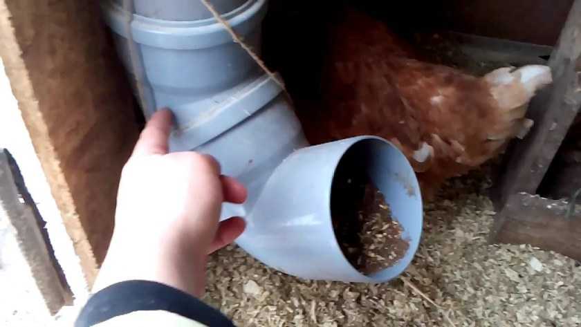 Один прямой кусок вставляют в гнутую трубу, соединяют посредством муфты. Такое соединительное колено может остаться после организации водопровода. Корм засыпают сверху, а когда первый слой съедается, то под силой тяжести он автоматически восполняется.