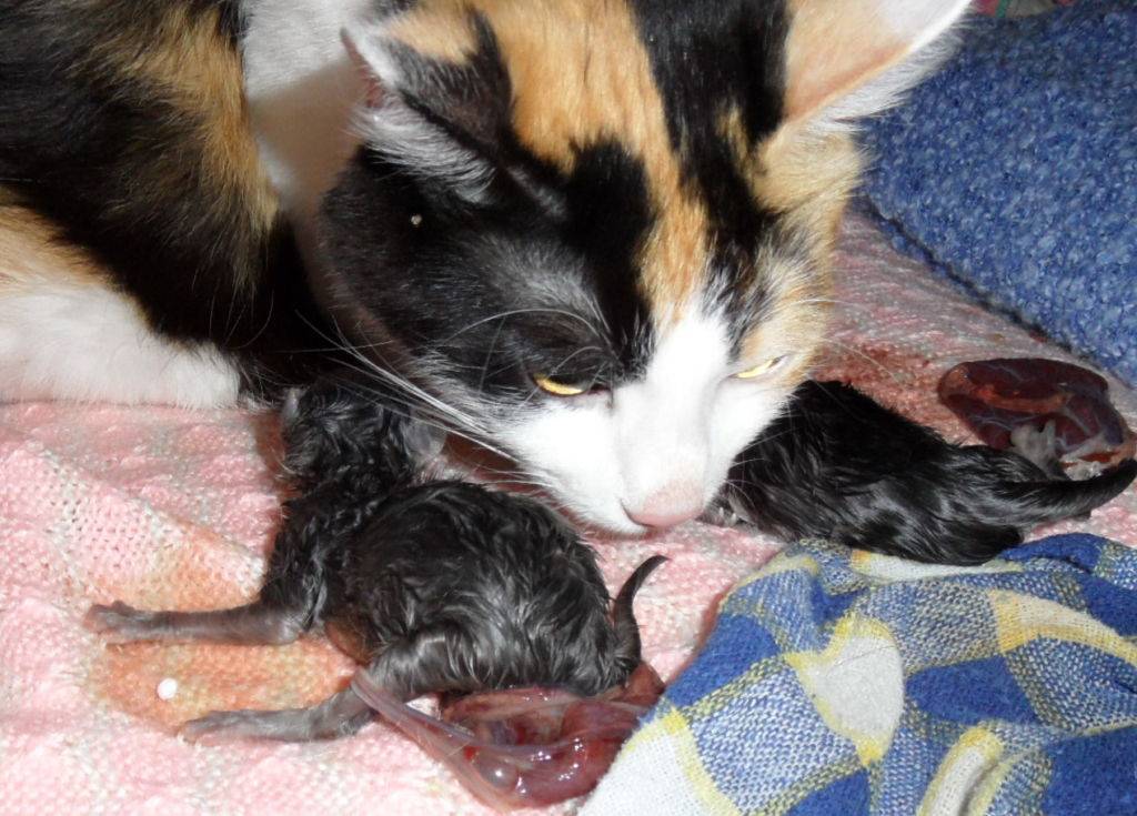 Кошка не ухаживает за новорожденными. Вылизывание котят сразу после их рождения необходимо не из соображений гигиены, а для начала нормальной жизнедеятельности потомства. Если кошка не начала обхаживать котенка, нужно разорвать околоплодный пузырь, перерезать пуповину, после чего обтереть малыша чистой тряпочкой и спринцовкой удалить слизь из носа и рта. Далее его желательно положить к соскам кошки – он начнет пить молозиво, массируя лапками живот и соски, и весь процесс пойдет быстрее.