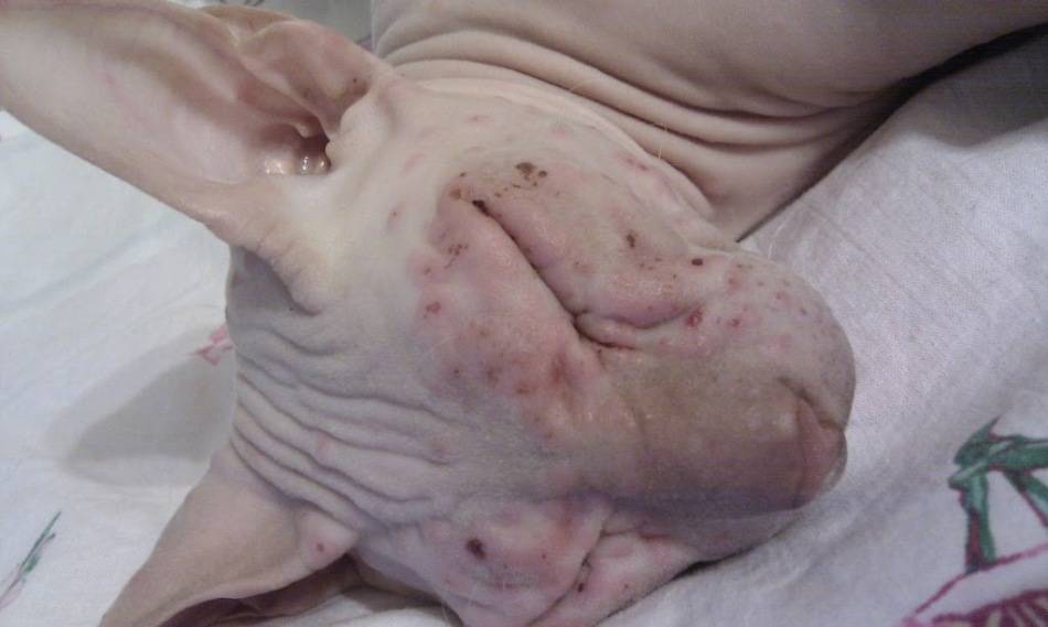 Самое уязвимое место каждого лысого кота – его кожа. Из-за избыточного выделения кожного сала и несвоевременного его удаления на коже сфинксов часто появляется угревая сыпь.