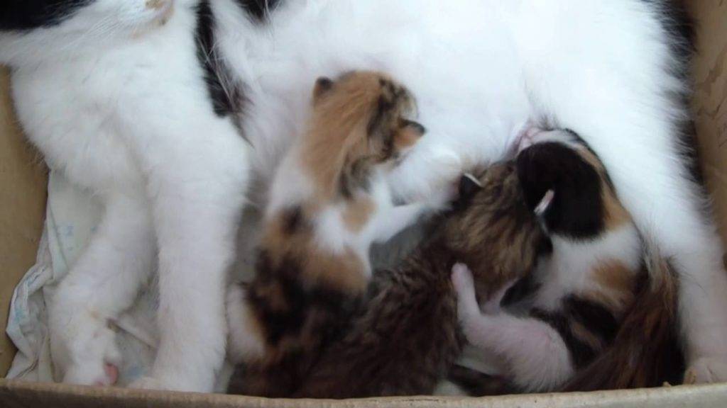Трехцветная кошка с котятами
