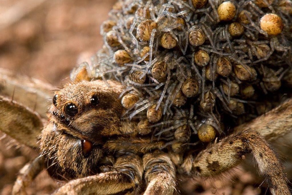 В течение 40-50 дней самка носит созревающее потомство на своих паутинных бородавках (особых парных выростах, расположенных на брюшке). Вылупившиеся паучата взбираются на спину матери и находятся там, пока не научатся питаться без ее помощи.
