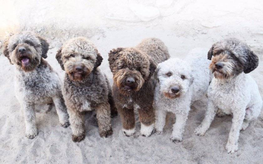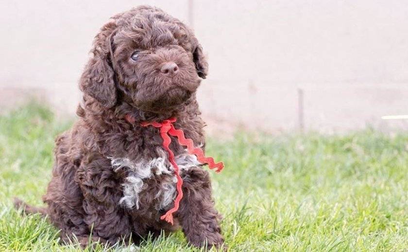 - Шерсть. Очень густая, курчавая и жесткая. Есть плотный водонепроницаемый подшерсток. Пряди имеет умеренную длину, завитки находятся по всему корпусу. На морде выражена растительность (борода и брови). Допускается сплошной белый окрас (или с пятнами), оттенки коричневого. У собак с темной шерстью присутствует маска на морде.