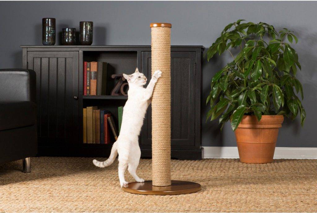 - Столбики. Выполнена в виде столбика на подставке, часто на верхушку столба крепится мячик или другая игрушка на веревочке, чтобы кошке было интереснее точить когти.