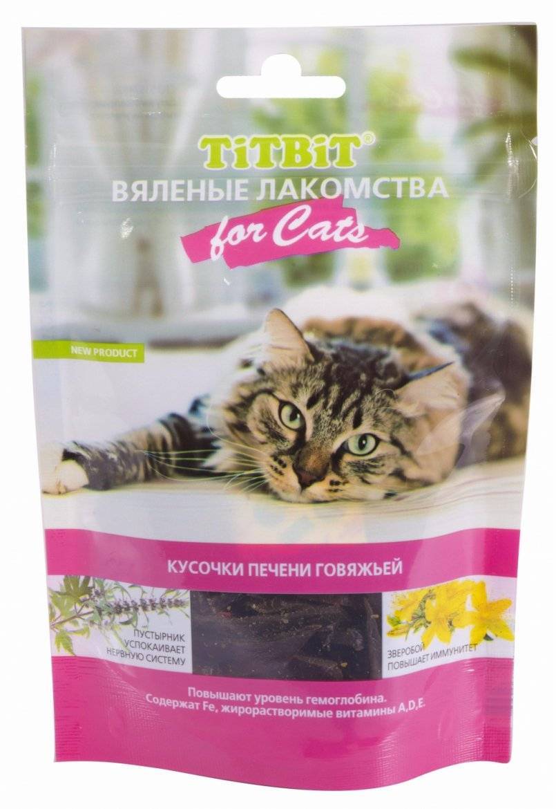 TITBIT представляет собой отечественное производство. Интересна линейка «Вяленые лакомства для кошек» в пяти вариантах. На первом месте всегда компонент животного происхождения. Это может быть филе курицы, говяжьи кишки, лёгкие, печень и сердце.