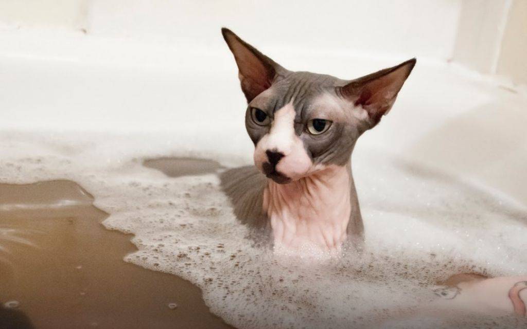 У кошек без шерсти очень нежная кожа, которая нуждается в заботе и гигиене. В складках часто скапливается грязь, поэтому шкурку промывают детскими шампунями. Удивительно, но многие киски готовы часами плескаться в тёплой ванне. Задача хозяина проследить, чтобы в уши не попадала вода – можно заложить ушные проходы ватой. Для ванны оптимальна температура воды в 36-38°С. На дно выкладывают резиновый коврик — без него поскользнувшаяся кошечка надолго запомнит обиду на вас и весь белый свет.