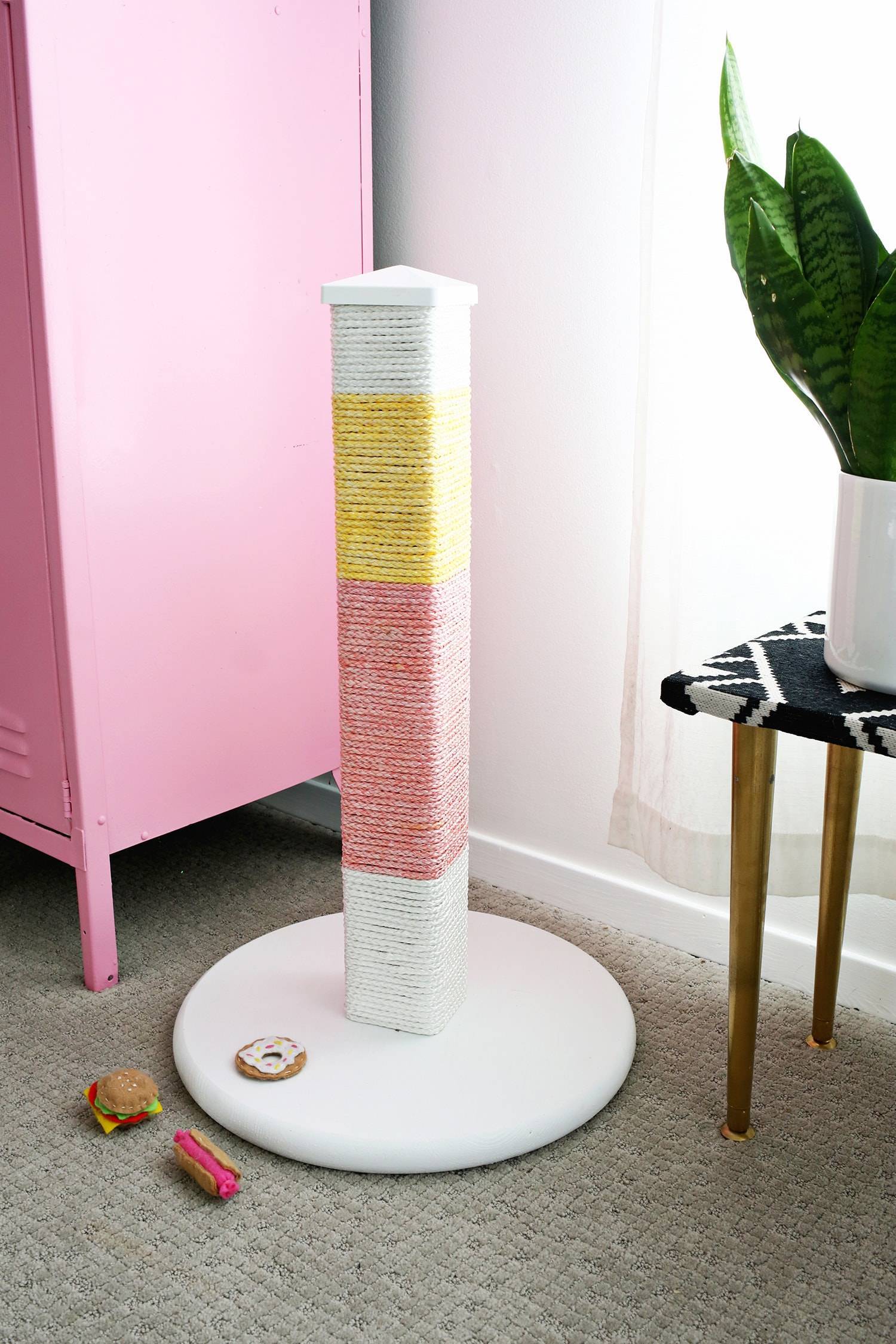 Для когтеточки обмотать стойку можно тем же ковром, а можно использовать сизалевый шнурок, аналогично предыдущим вариантам.