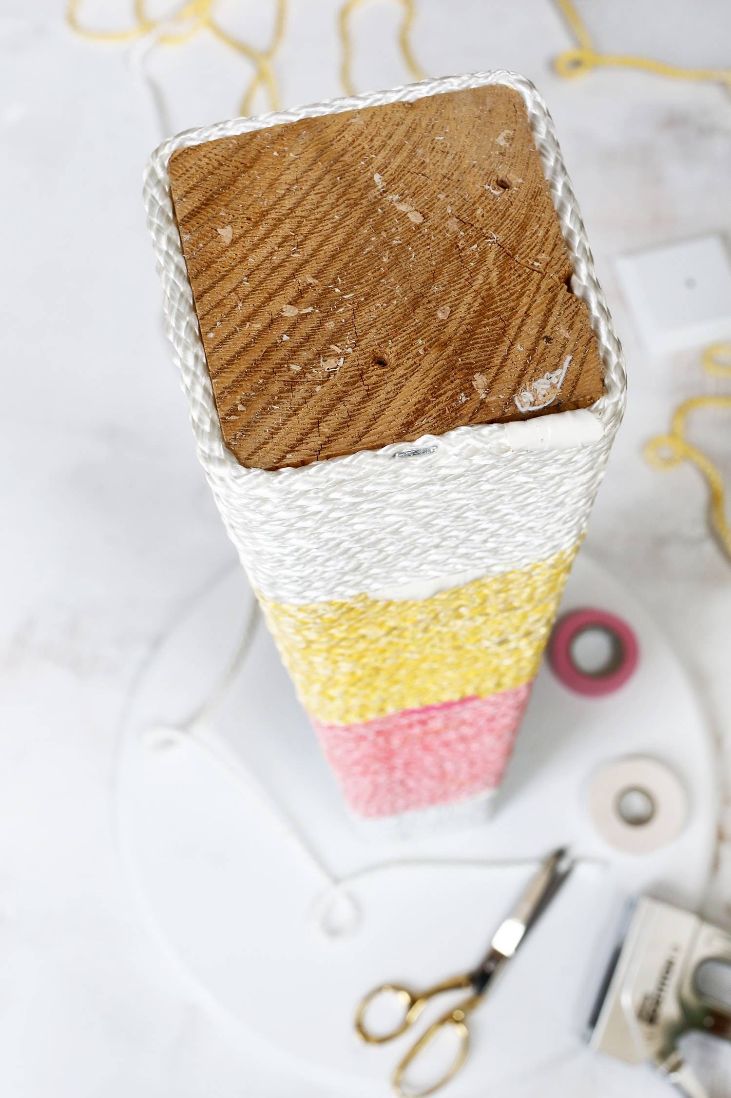 Шаг 20. Полностью оберните трубу канатом. В верхней части зафиксируйте край каната при помощи клеевого пистолета. Для верности можно проклеить несколько витков в середине.