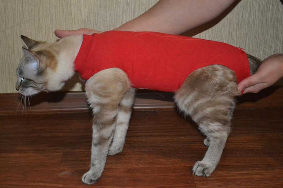 После того как попона будет надета, владелец должен следить, чтобы кошка не пыталась грызть или снимать ее. Тогда реабилитация в послеоперационный период пройдет успешно и рана затянется без осложнений.