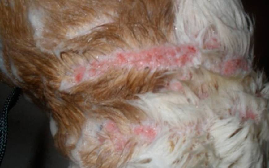 2. Клинической картины – оценивают внешний вид и характерные зоны кожного воспаления. Так, при реакции на слюну блох чаще всего поражения локализуются в области крестца (основания спины), бедер и основания хвоста; при аллергии – в области шеи; воспаление перианальных синусов приводит к поражениям в области основания хвоста; при отите очаги острого влажного дерматита появляются на морде