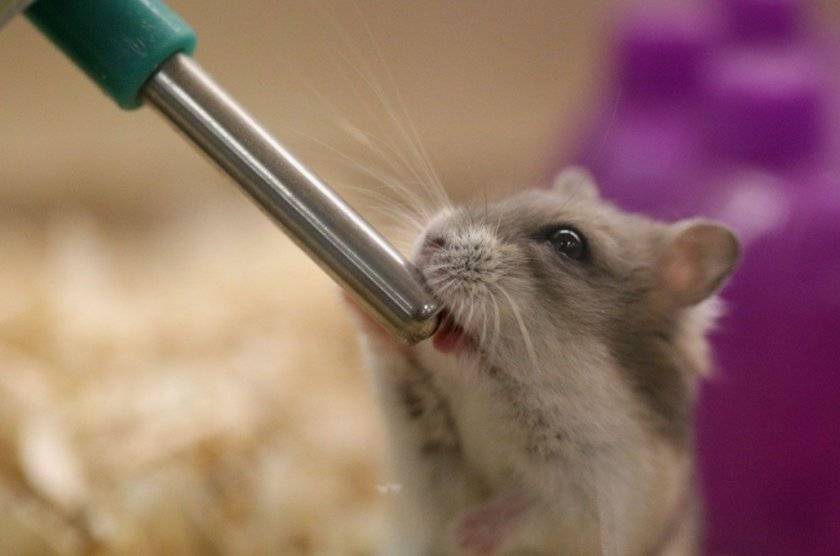 Если питомец не проявил интереса к поилке, что бывает очень редко, необходимо взять его в руки, осторожно поднести к трубке, подающей воду. Как только зверёк заметит каплю жидкости, то сразу поймёт для чего нужен новый предмет в клетке