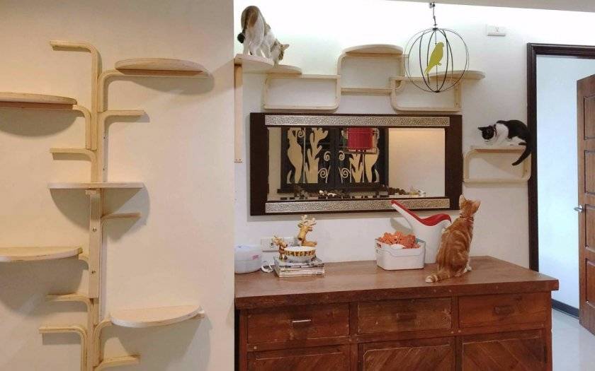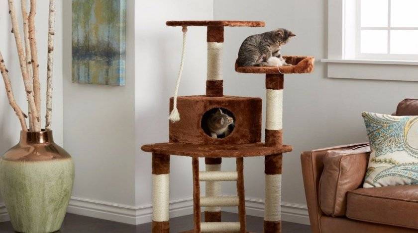 Большие игровые площадки для кошачьих — это сооружения, где есть все для полноценного проживания домашних животных: будки, диванчики, когтеточки, подвешенные безделушки, полочки, лестницы и многое другое. Подобные игровые площадки подходят владельцам целого кошачьего семейства. Учитывайте, что такие комплексы займут достаточно большую площадь в квартире.
