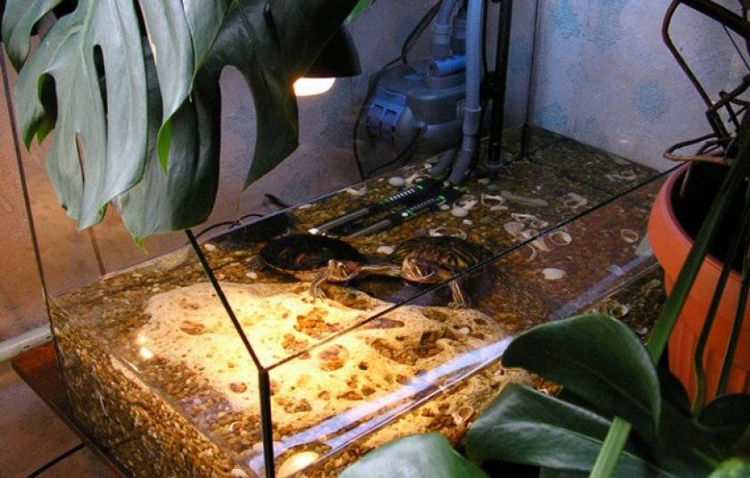 Для комфортного существования рептилии террариум для черепах оборудуют двумя лампами: