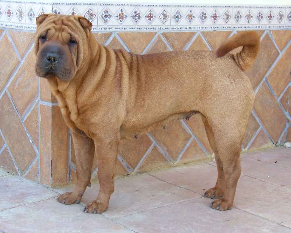 - Бладхаунд. Эта порода очень похожа на шарпея. Отличительной чертой являются висячие уши и прямой хвост. Окрас шерсти чёрный с желто-коричневыми пятнами, красно-коричневый или сплошной ярко-рыжий. Шерсть жёсткая и короткая. Характер добродушный и добрый без агрессии.
