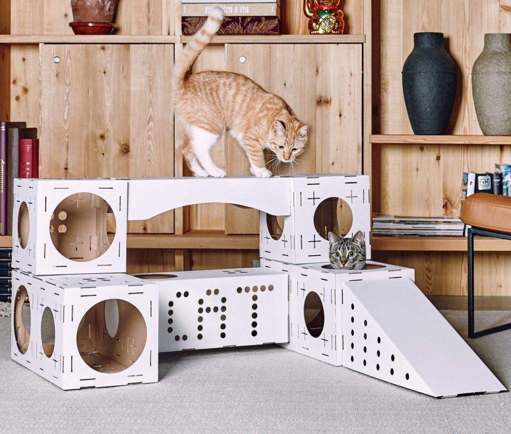 Некоторые хозяева создают своими руками для домашних любимцев сложные игровые комплексы. Для подобных сооружений используют картон, фанеру, пластиковые трубы, шланги, которые можно приобрести в отделе сантехники. Воплотить подобный проект в жизнь сможет любой мужчина. Для него потребуются следующие материалы: