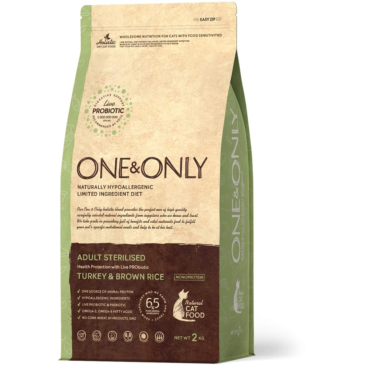 One&Only Sterilised — для стерилизованных (кастрированных) особей, а также животных пожилых (старше 7-ми лет), разработано 3 вида корма: с ягненком, уткой и рисом. В процентном соотношении количество белков, жиров и углеводов у них равное, одинаков и процент мяса в составе. Метаболическая энергия: немного ниже 4.000 ккал/кг.