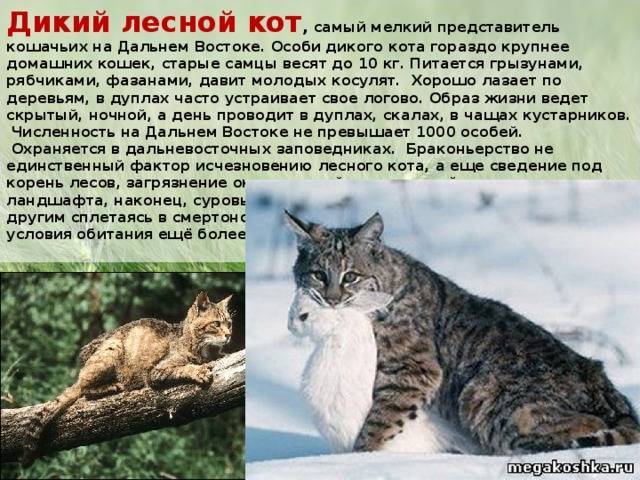Несмотря на пугливость и осторожность, суровые морозы вынуждают этих кошек приближаться к жилью человека и охотиться в старых домах на грызунов и домашних птиц