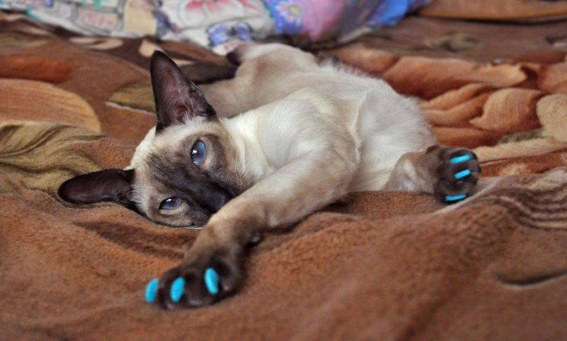 - Хвостатые медленно привыкают к новым разноцветным коготкам. Должно пройти определенное время, пока животное привыкнет и адаптируется. У каждого оно разное. Но если колпачки приклеены правильно, то дискомфорт уйдет быстро.