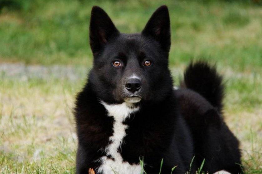 Карельская медвежья собака имеет средние размеры, чёрно-белый окрас и закрученный хвост