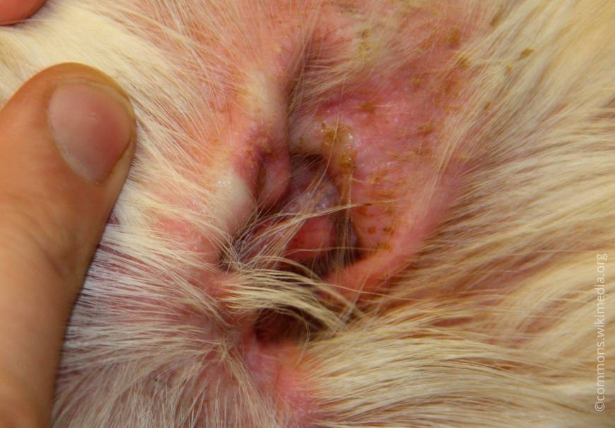 Это связано с тем, с постоянным расчесыванием. В ход идут не только лапы, но и посторонние предметы, о которые животное может почесать, а точнее разодрать ухо.