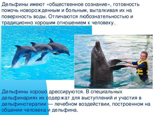Социальная жизнь дельфинов чем-то похожа на нашу, при этом у них чрезвычайно развита взаимопомощь. Раненого дельфина не только не бросают, но и, подныривая под него, поднимают к поверхности воды, чтобы «болящий» мог вдохнуть кислород – ведь дельфины, как и мы, дышат воздухом. А самки создают коммуны, чтобы заботиться о новорожденных детенышах.