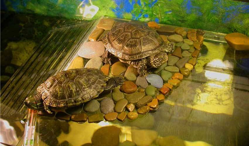 Акватеррариум должен быть такого размера, чтобы черепашки могли иметь много места для плавания с обязательным выходом на сушу. Террариумы могут быть низкими с большой площадью, а с помощью камней можно выложить естественный выход на берег.
