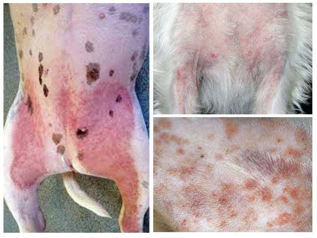Собака часто чешется, особенно в районе пальцев лап, брюха, хвоста, спине. Под шерстью образуются красные пятна, которые легко заметить, особенно у короткошерстных пород собак.
