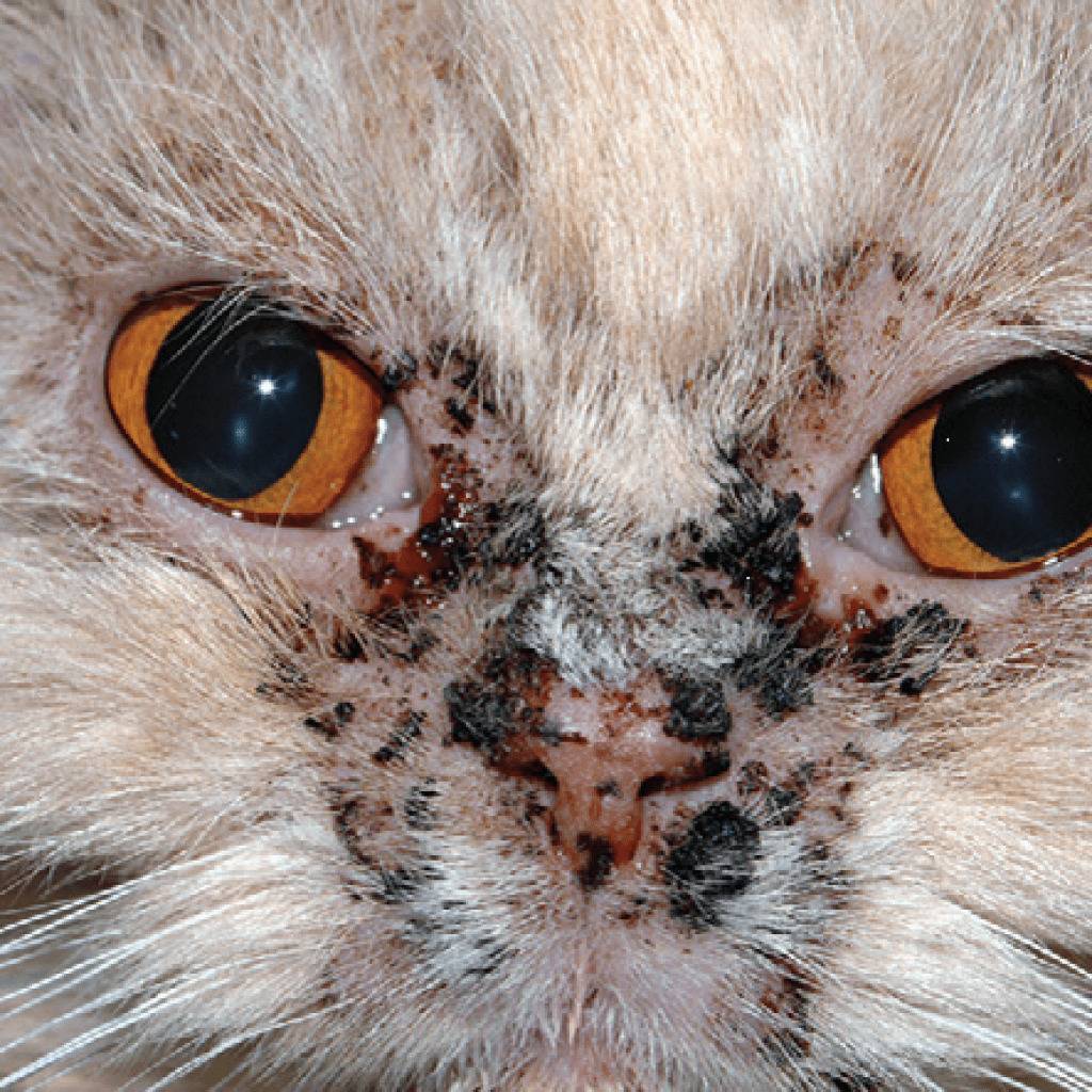 Если кот страдает черными шелушащимися корочками на носу продолжительное время, то причину нужно искать в вирусах и инфекциях. Дополнительные симптомы таковы: