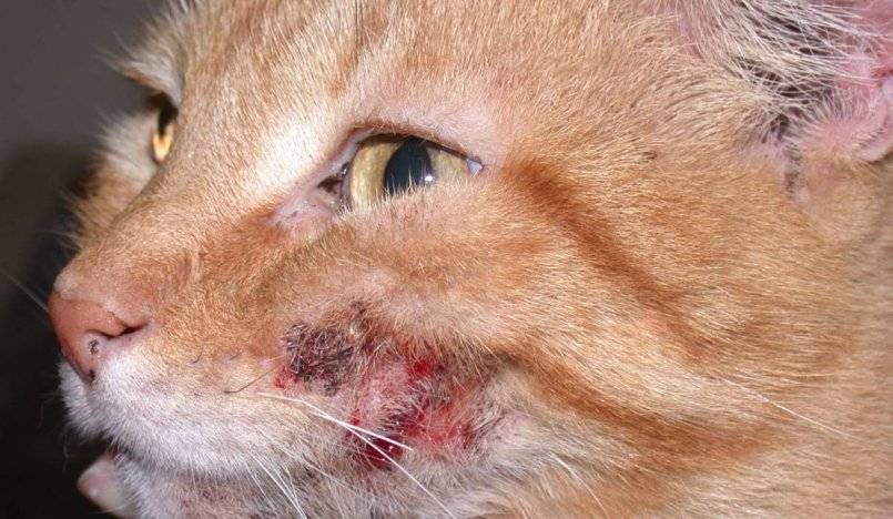 При поражении клещом Scabies симптомы в основном проявляются на мордочке кота. Этот вид клеща опасен тем, что может спровоцировать заражение крови.
