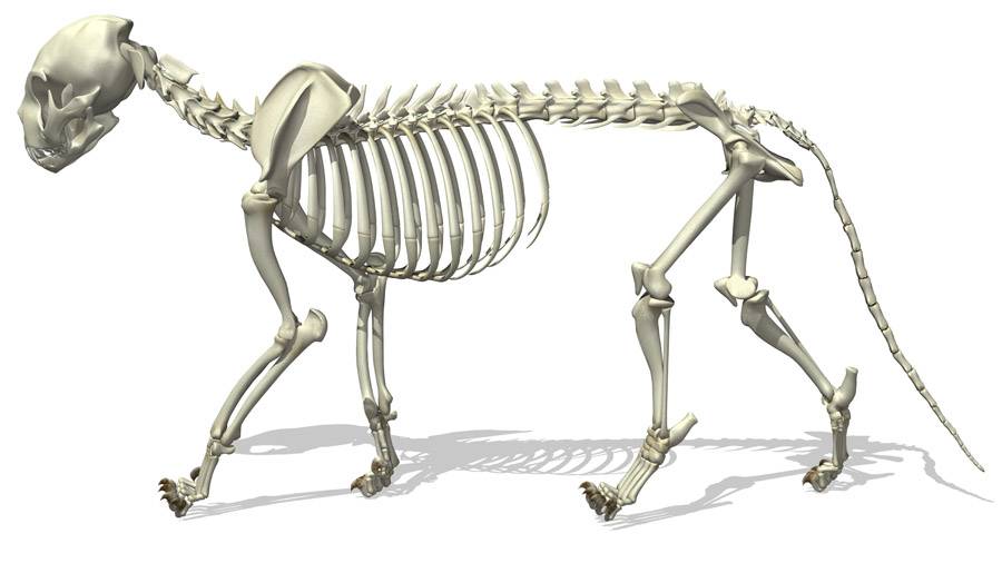 Общая схема строения скелета кошки подобна строению скелета других млекопитающих, за исключением некоторым отличий в формах и расположении отдельных костей, что связано с горизонтальным положением позвоночника и максимальной приспособленностью к образу жизни хищника. Кроме этого различия в формах и строении отдельных костей могут быть обусловлены породными особенностями. К примеру, у сиамцев кости более узкие и длинные по сравнению с персидскими котами. По фото ниже можно понять, как выглядит скелет кошки без учета селекционных особенностей.