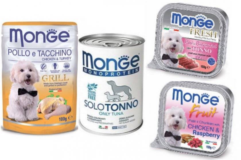 Продукция «Monge» подразделяется на три базовых направления: сухие и влажные корма, ветеринарные виды питания. Сухие виды кормов изготавливаются путем обезвоживания приготовленного мясного сырья. Влажные (консервированные) виды — это паштеты или обработанные мясные кусочки.