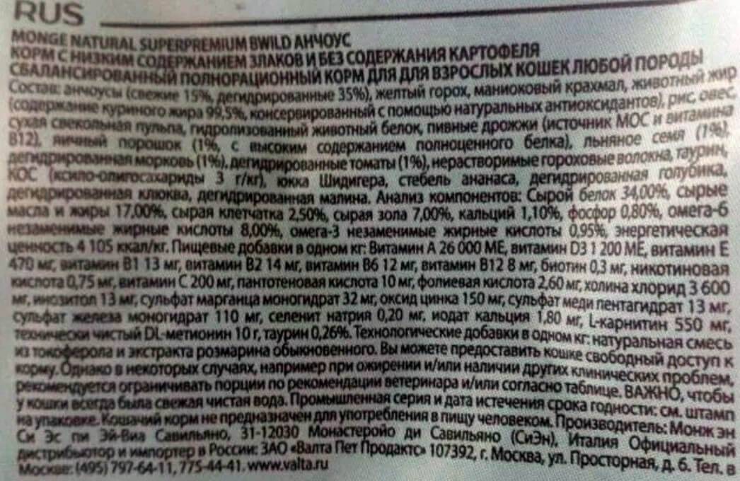 При анализе продукции Монж меня насторожил тот факт, что производитель никогда не употребляет слово «мясо» на упаковках с кормом в разделе о его составе. Это беспокоит многих кошковладельцев, поскольку логично заключить, что при производстве используется не только чистое мясо курицы, например, но и другие её части (кожа, хрящи, субпродукты и пр.).