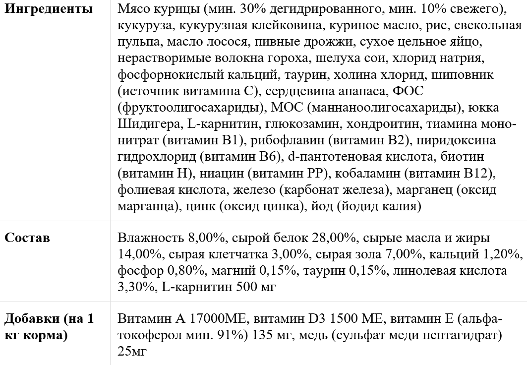Корма классической линейки различаются по составу, концентрации питательных веществ и энергии. Для растущего молодняка необходим высокий уровень протеина (34%) и калорий, что достигается большим количеством жира. Производитель не считает необходимым сообщать подробный рецепт кормосмеси: