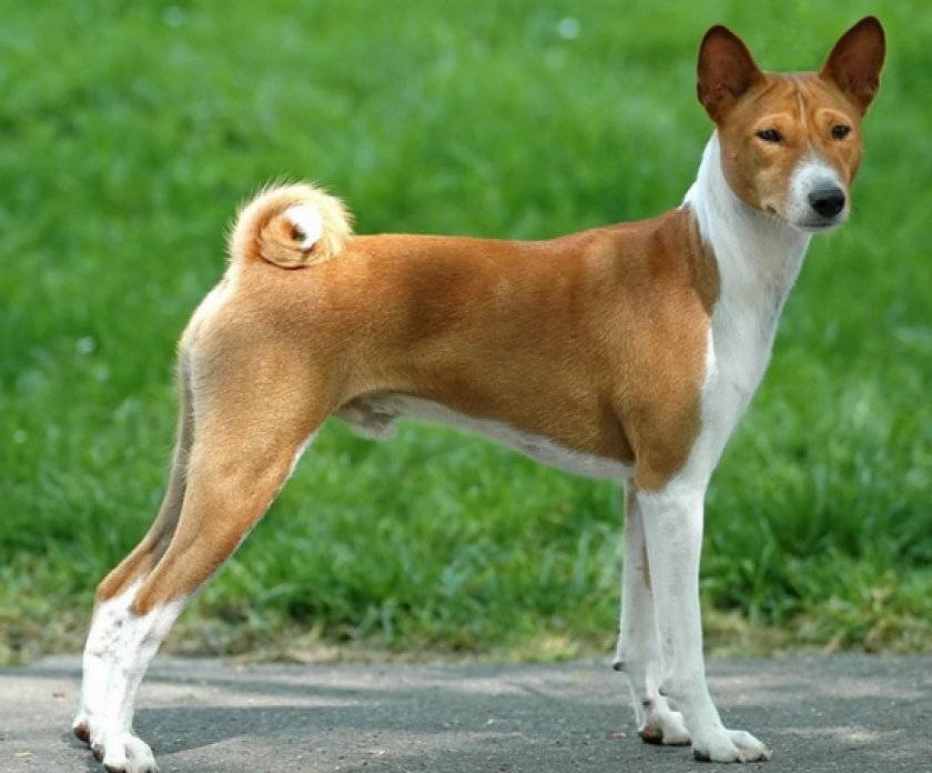 Вне зависимости от цвета шерсти обязательно наличие белоснежных лап, груди и кончика хвоста. Особенностью представителей данной породы является появление морщин в лобной области при сведении ушей. Также для басенджи характерен закрученный хвост. На фото ниже можно увидеть, как выглядит типичный представитель данной породы.