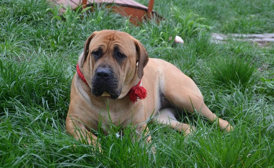 Голова очень крупная, с массивным черепом округлой формы. Она надежно посажена на мощную шею и вполне пропорциональна к телу собаки. Затылочный бугор едва обозначен, а вот надбровные шишки обозначены четко. Стоп не отчетлив. Скулы плоские. Морда квадратной формы, длинная, хорошо очерченная, несколько суженая к мочке носа. Спинка носа ровная, широкая. Нос большой, черный с широко открытыми ноздрями. Губы хорошо развиты, но не полные. Брылы лишь обозначены. Края губ интенсивно пигментированы черным цветом. Челюсти мощные в укусе, с рядом белых крупных зубов (42 зуба). Клыки очень крупные. Прикус — ножницеподобный (предпочтительнее) или клещевидный.