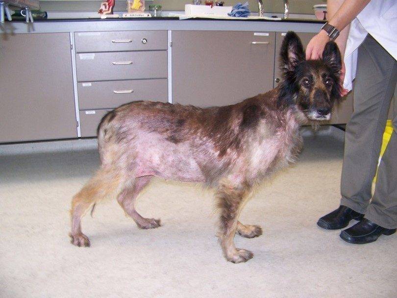Алопеция эндокринного характера чаще поражает взрослых или пожилых питомцев. Особенно кобелей. По всему телу появляется сухость кожного покрова, начинает выпадать шерсть, возникают раздражения и расчесы.
