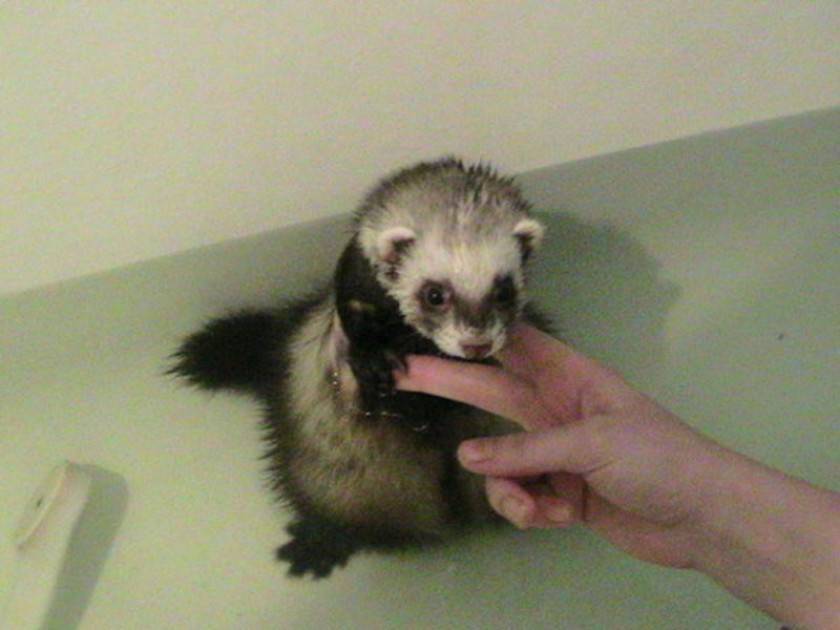 Хорьки обожают принимать водные процедуры, но после купания у них становится более выраженным характерный резкий запах. Из-за этого купать питомцев следует по мере того, как будет загрязняться шерсть. Купание можно проводить в не очень горячей ванночке или под душем. При купании используется специальный шампунь для животных. Обязательно каждый месяц подстригать ногти питомцу