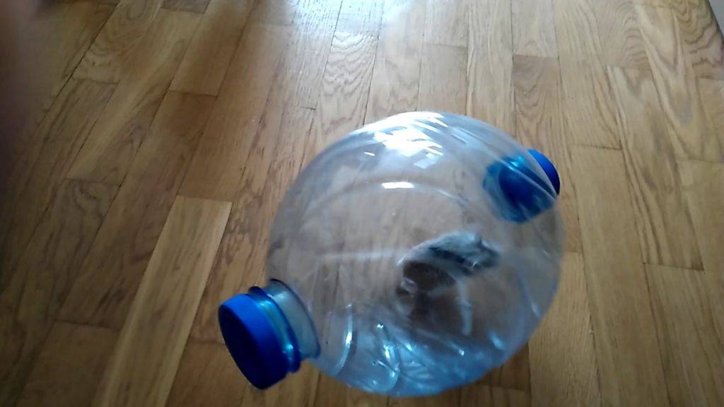 В бутылке прорезаются вентиляционные отверстия, после чего она готова к эксплуатации. Такое устройство нельзя сравнить с прогулочным шаром – бутылка имеет совсем другую форму. Однако она легко катается по квартире и защищает питомца от опасностей, на которые так богаты домашние условия. В отсутствии шара такая игрушка успешно обеспечивает грызуну физическую активность и даже некоторое умственное развитие: зверьку придется приноровиться под управление продолговатым предметом.