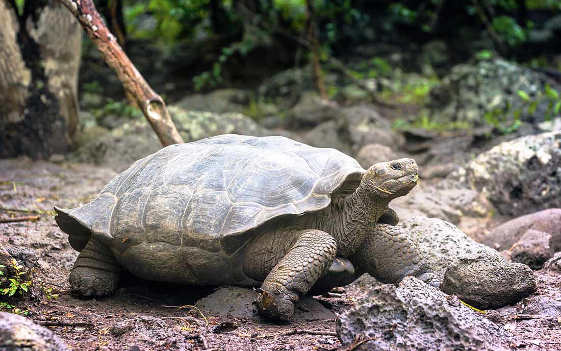 3. Слоновая или галапагосская черепаха (лат. Chelonoidis elephantopus). В длину достигает 2 метров, весит, в среднем, 350 кг. Существует 16 подвидов этой черепахи. Отличительная черта – длинные вытянутые шея и лапы. Питается растительностью, пьет очень много воды, в засушливый период переходит на кактусы и кустарники, ядовитые для других животных. Для человека слоновые черепахи опасности не несут.
