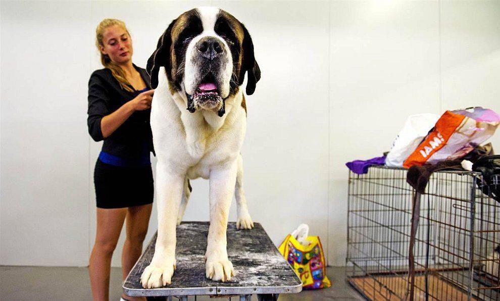 Собаки данной породы отличаются параметрами, вес и размер сенбернара впечатляет. Взрослые особи обладают массивной шеей и головой, лоб выпуклый. Рост взрослого кобеля в холке варьируется от 70 до 90 см, рост сук – от 60 до 80 см. Средняя масса тела не меньше 80 килограмм, регулярные тренировки собак позволяют достигнуть массы в центнер без вреда для здоровья сенбернара.