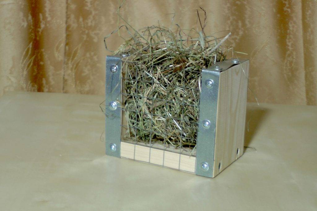 Дальше оцинкованная сетка скручивается и помещается в крышку, аналогичным образом фиксируется и второй край. Процесс не требует применение силы, справиться можно с минимальными усилиями. Сетка должна быть упругой и устойчивой, иначе придется использовать проволоку, чтобы укрепить сенницу, дополнительно обмотав конструкцию. На этом процесс изготовления закончен, можно смело внедрять устройство в повседневную жизнь пушистого любимца. Чтобы наполнить устройство сеном, достаточно снять одну из крышек.
