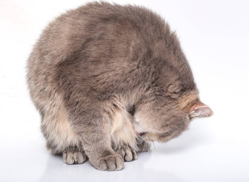 При дерматофитиях кошка интенсивно чешется, появляются очаги алопеций, шелушения, вокруг места поражения формируется плотная, красноватая кайма (стригущий лишай).