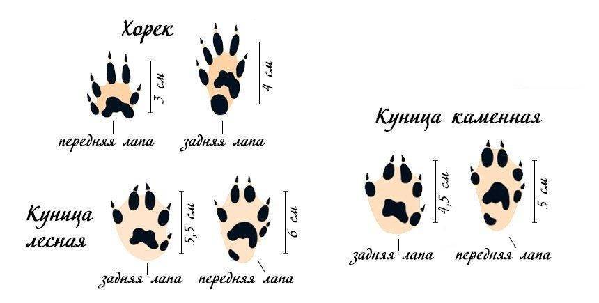 Ласки и горностаи тоже охотятся на мелких грызунов и домашнюю птицу по ночам. Эти юркие животные внешне очень похожи, но горностай крупнее ласки, поэтому его следы почти в 2 раза больше.