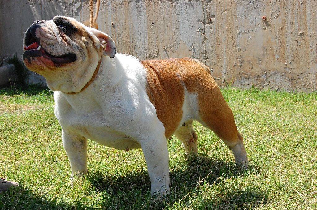 От английской разновидности породы произошли все виды бульдогов. Это собака, чей вес достигает 25 кг, а высота в холке – 40 см. Окрас разнообразный: тигровый, красный, коричневый или рыжий с белыми пятнами. В Европу предки английского буля попали вместе с кочевыми народами. Их оценили за свирепость: псов использовали для облав и травли на быков. Собаки вцеплялись в морды животных и душили их.