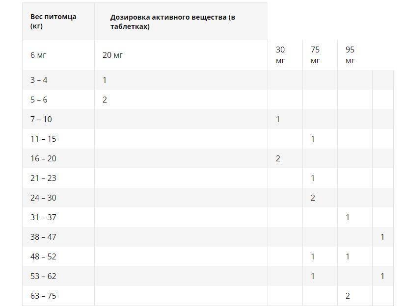 | Вес собаки в килограммах | Количество таблеток | Дозировка действующего вещества, мг |