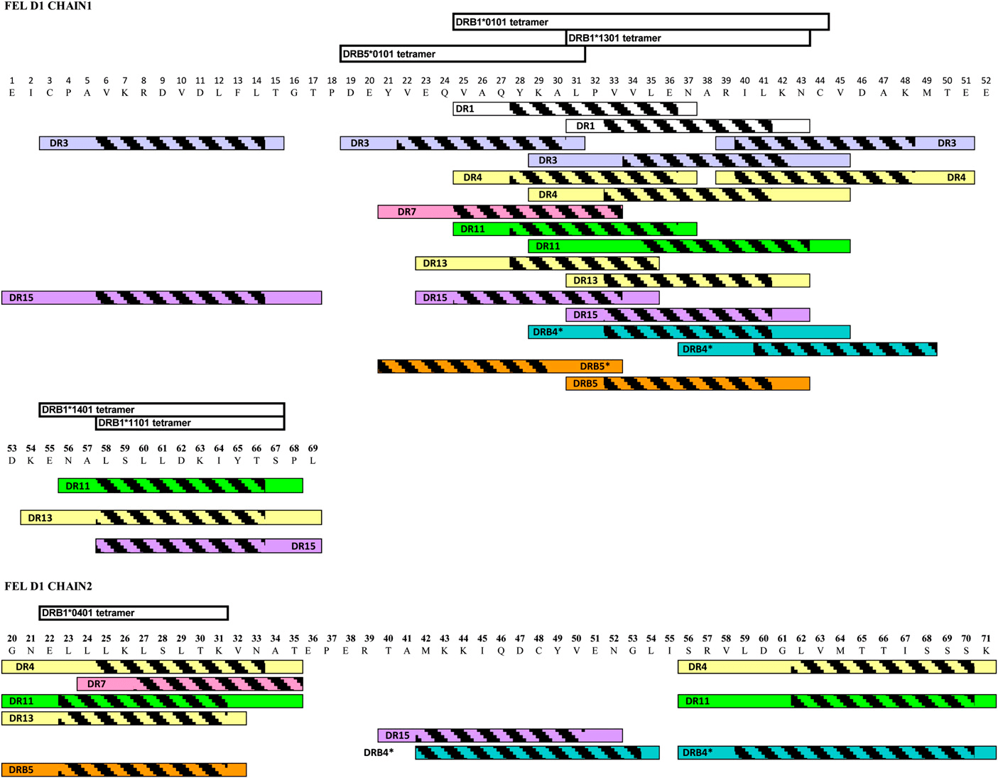 Рисунок 2. Полная карта эпитопов аллергена Fel d1. Штриховкой выделены области связывания с MHC II.
