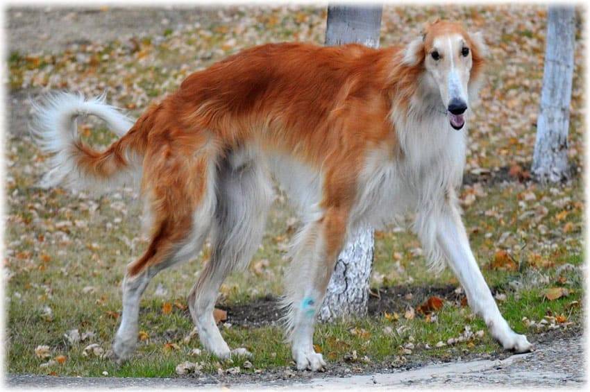 На фото русская псовая борзая бело-рыжего окраса